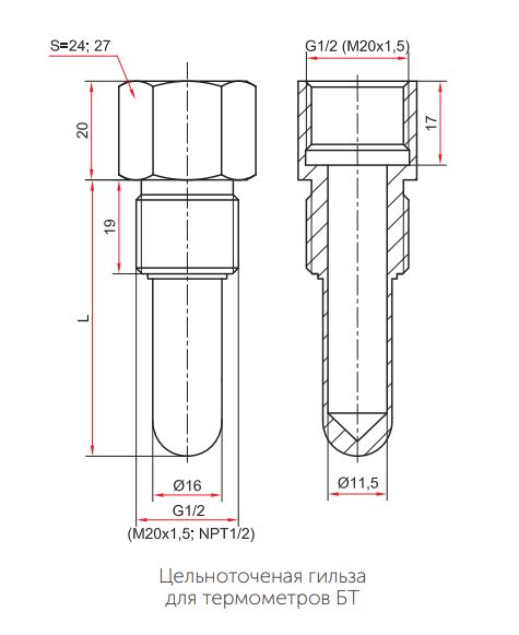 | Гильзы цельноточеные до 60 МПа, для термометров биметаллических коррозионностойких серии 220, тип БТ | внешний диаметр погружной части — 16 мм, резьба присоединения — G½, М20×1,5 или NPT½ |