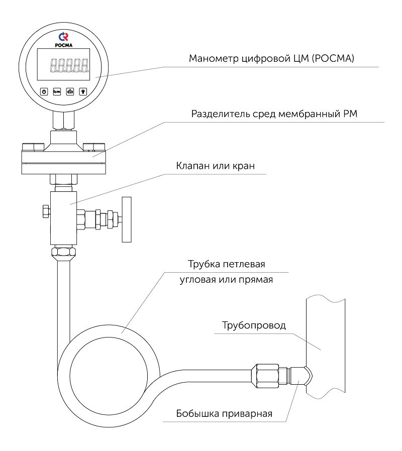 Монтаж/демонтаж цифрового манометра ЦМ должен производиться при отсутствии давления в трубопроводе. Приборы с верхним пределом измерения (ВПИ) до 40 кПа должны быть установлены в нормальном рабочем положении (положение прибора штуцером вниз). Положение при монтаже остальных приборов – произвольное.