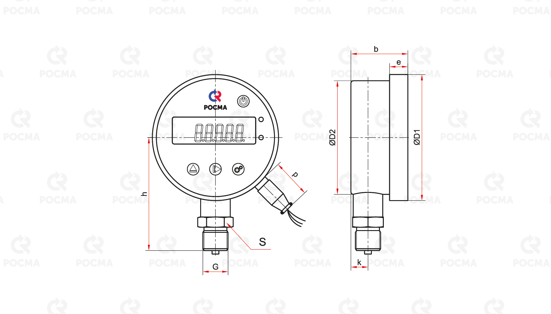 Дополнительные функции: подсветка дисплея, установка нуля, переключение между единицами измерения давления, индикатор состояния батареи. Для манометра с диаметром корпуса 100 мм доступна функция отображения пиковых значений.