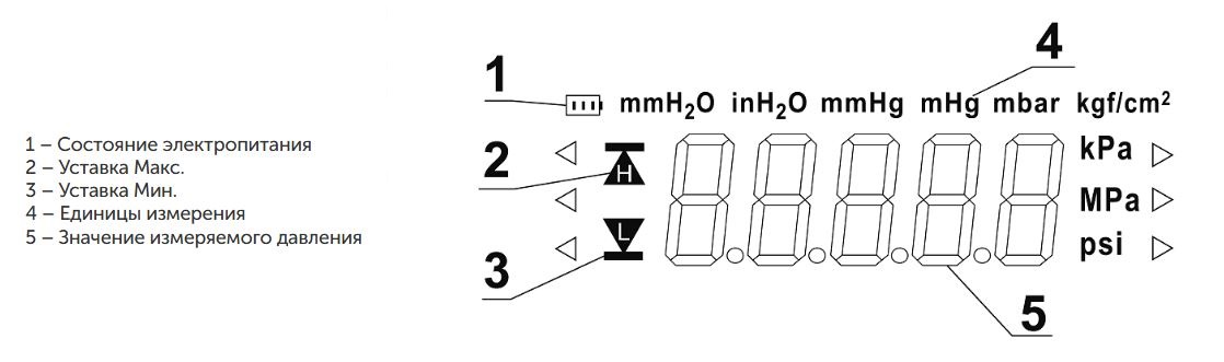 | МПа, кПа, Па, psi, бар, мбар, мм рт. ст., кгс/см2, дюйм вод. ст., мм вод. ст., дюйм рт. ст. |