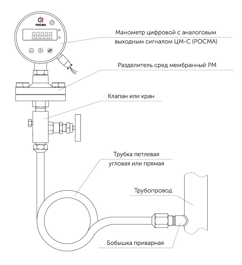 Монтаж / демонтаж цифрового манометра ЦМ-С должен производиться при отсутствии давления в трубопроводе. Положение прибора при монтаже – произвольное. Перед монтажом убедитесь, что манометр соответствует рабочим параметрам системы.