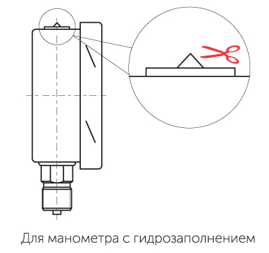 Для манометра с гидрозаполнением: после монтажа необходимо срезать специальный выступ на пробке прибора или проколоть отверстие в пробке.