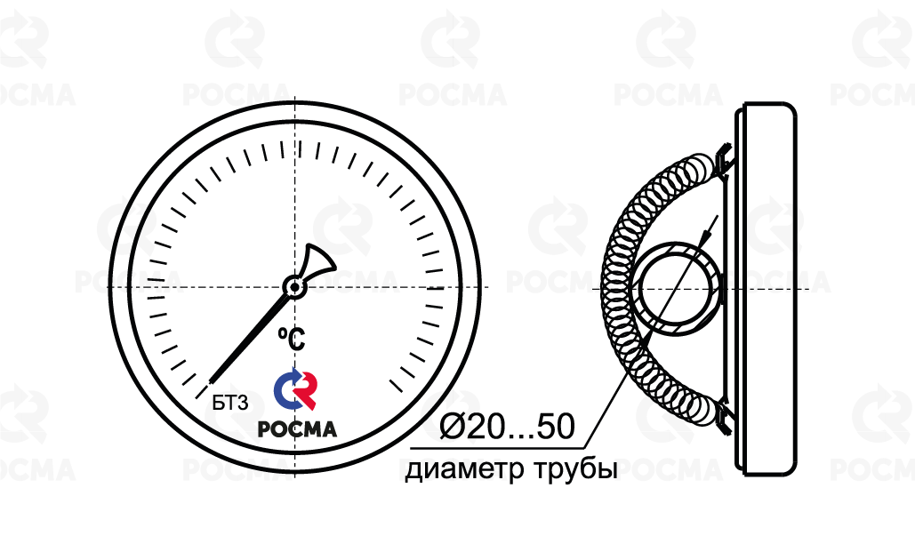 Термометр биметаллический с пружиной для крепления на трубе предназначен для наружной установки на металлические трубопроводы диаметром от 20 мм до 50 мм.