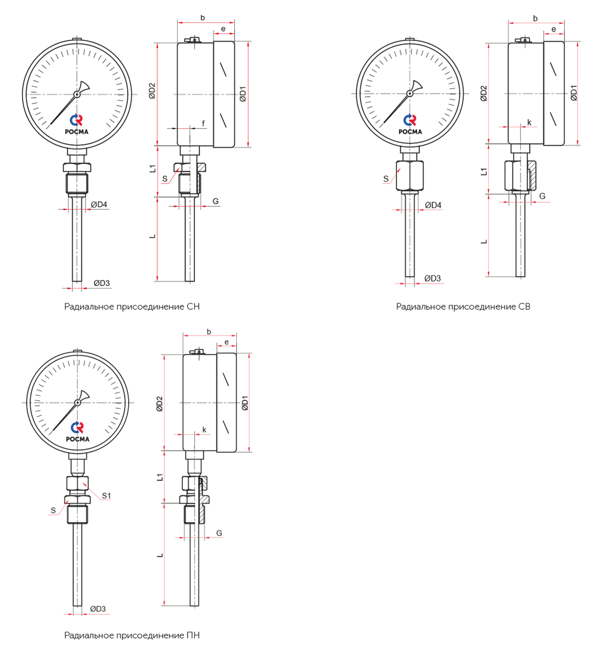 Термометры БТ, серия 220 с возможностью гидрозаполнения силиконом (радиальное присоединение с резьбами CH, CB, ПН)