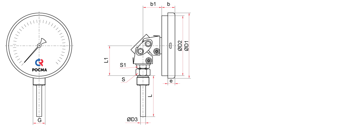 При монтаже прибора на трубопровод приваривается бобышка с внутренней резьбой. В бобышку вкручивается шток термометра. В случае использования термометра с защитной гильзой из нержавеющей стали на давление в системе до 25 МПа или 60 МПа, в бобышку вкручивается гильза, а в гильзу устанавливается термометр.